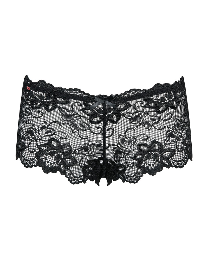 Schwarze Panties Idillia von Obsessive komplett aus zarter Blütenspitze. Rundum weich und elastisch für hohen Tragekomfort. Vorne am Bund mit Satinschleifchen verziert.