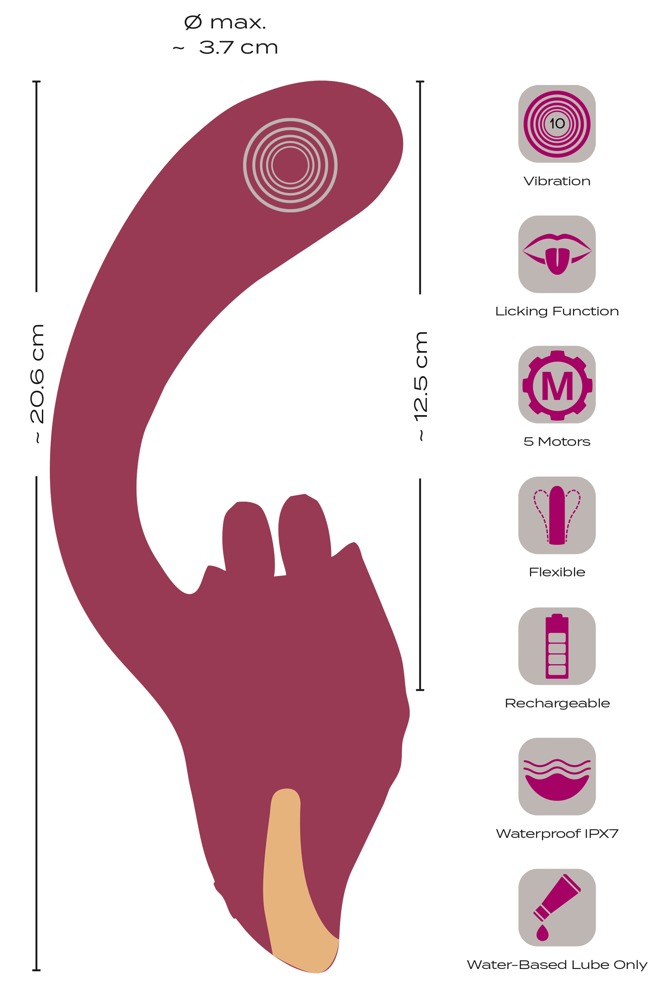 Insgesamt 5 leistungsstarke Motoren gewährleisten eine zuverlässige und kraftvolle Dual-Stimulation. 10 Vibrationsmodi im prallen Kopf des gebogenen Schaftes und 10 Leckmodi der beweglichen Doppelzunge bieten abwechslungsreiches Vergnügen. Die beiden Funktionen sind bequem per Knopfdruck direkt am Toy steuerbar – getrennt oder aufregend miteinander kombiniert.