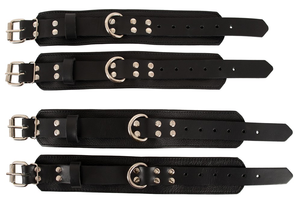 Mit diesem Bettfessel-Set von ZADO lässt sich jedes Bett in einen profimäßigen Bondage-Playground verwandeln. Das H-Gurtsystem aus verstellbaren, reißfesten Webriemen passt unter jede Matratze. An den jeweils 4 Karabinerhaken der Riemen werden dann die Leder-Fesseln für Hände und Füße eingehakt. Die bequemen Hand- und Fußfesselmanschetten aus robustem Leder sind mit Schnallenverschlüssen ausgestattet und somit im Umfang passend verstellbar.