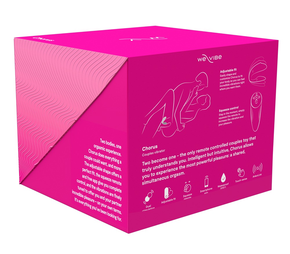 10 abwechslungsreiche Vibrationsmodi sind mit der Fernbedienung bequem steuerbar. Dank Squeeze-Funktion reagiert die Fernbedienung intuitiv auf Druck – je fester man drückt, desto stärker die Vibration. Der Chorus selbst verfügt über berührungsempfindliche Sensoren (Touch Sense), die während des Liebesspiels die Vibrationen über Körper- bzw. Fingerbewegungen anpasst. Mit der kostenlosen We-Vibe-App auf dem Smartphone sind noch mehr Vibrationsmodi, Synchronisation zu Musik und zusätzliche 3 Touch Sense Modi möglich. Ebenso kann man sich mit We-Vibe-Partnertoys verbinden und auch den Chorus über große Distanzen vom Partner fernsteuern lassen. Spaß ist überall ist möglich, denn der Chorus ist wasserdicht.