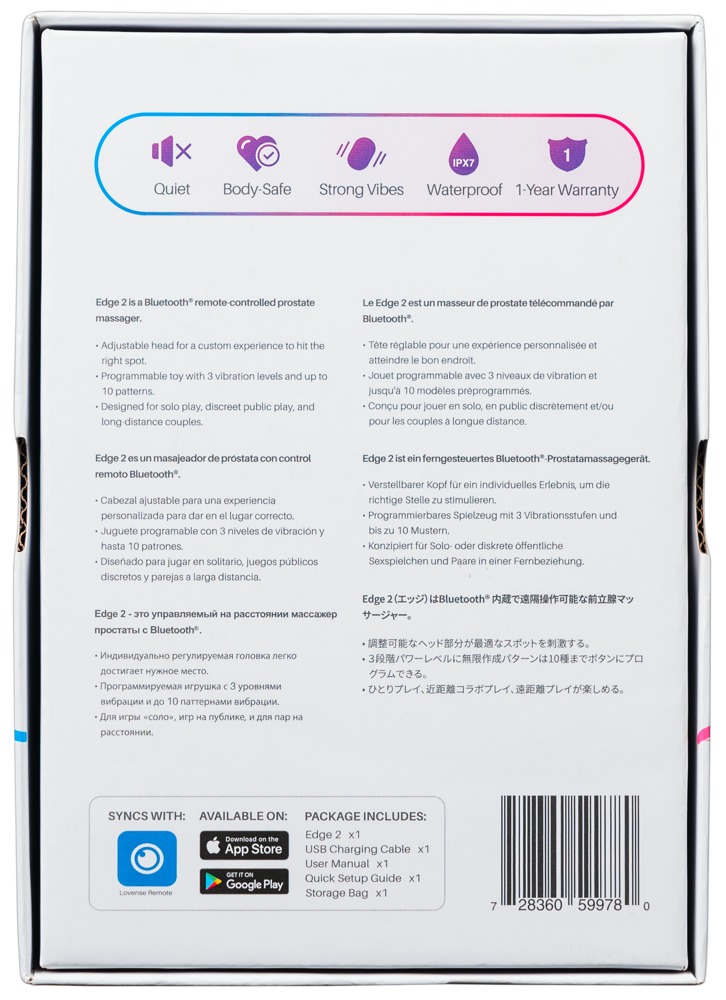 Per Bluetooth ist der Edge 2 kompatibel mit der Lovense App. Hier kann man zusätzlich unzählige Vibrationsprogramme selber kreieren und bequem über das Smartphone steuern und speichern. Auch vom Partner oder der Partnerin über große Entfernungen. Zusätzlich kann der Edge 2 seine Vibrationen per Sound aktivieren und zu Musikrhythmen synchronisieren. 3 Vibrationsstufen und 4 Vibrationsmuster können auch direkt am Toy bequem per Knopfdruck gesteuert werden.