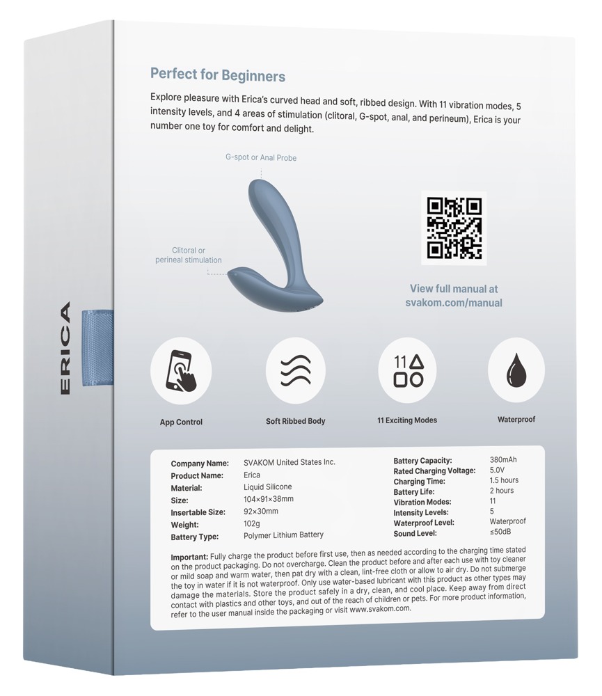 Wiederaufladbarer, wasserdichter Panty-Vibrator Erica von SVAKOM im ergonomischen Design, um gleichzeitig Vagina/G-Punkt und Vulva/Klitoris zu stimulieren. Ganz diskret und leise – niemand bemerkt das kleine Lust-Geheimnis! Der seidig softe, sanft strukturierte Silikon-Vibrator passt sich flexibel dem Körper und den Bewegungen perfekt an. Für höchsten Trage- und Verwöhnkomfort!