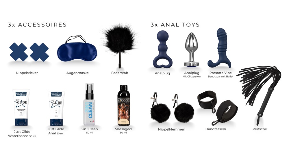 Enthalten sind: 2 x Premium-Toys, 9 x Toys, 3 x Anal-Toys, 3 x Accessoires, 4 x Liquids, 3 x Soft Bondage.