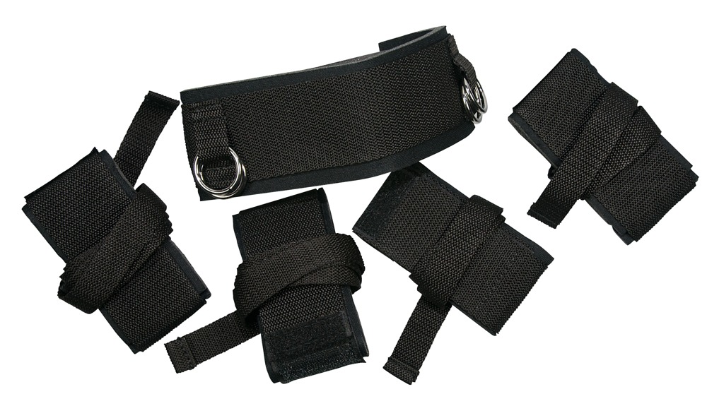 Reißfeste schmale Bänder verbinden die gepolsterten Hand- und Fußfesseln mit der Halsfessel. Die Bänder (132 cm) sind in der Länge so verstellbar, dass eine fast aufrechte Haltung möglich ist oder aber der/die Gefesselte gekrümmt ausharren muss. Auch die Arme sind (einzeln) in individueller Position fixierbar. Alle Fesseln mit Klettverschlüssen.