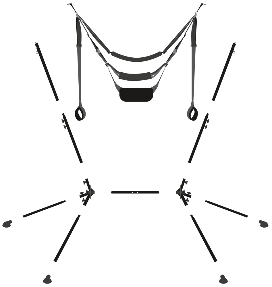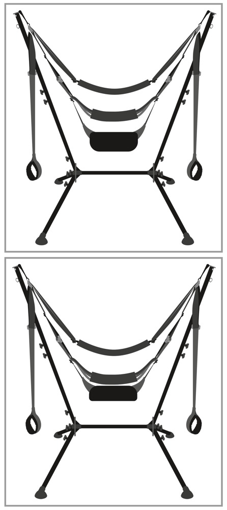 An reißfesten Gurten hängen das weiche Sitzpolster und die beiden soften Liegepolster für Rücken und Kopf/Nacken sowie die beiden bequemen Plüsch-Halteschlaufen für Hände, Beine oder Füße. Alle Gurte sind individuell in der Länge passend verstellbar. Die Sitzfläche kann auch abgenommen werden (Klett).