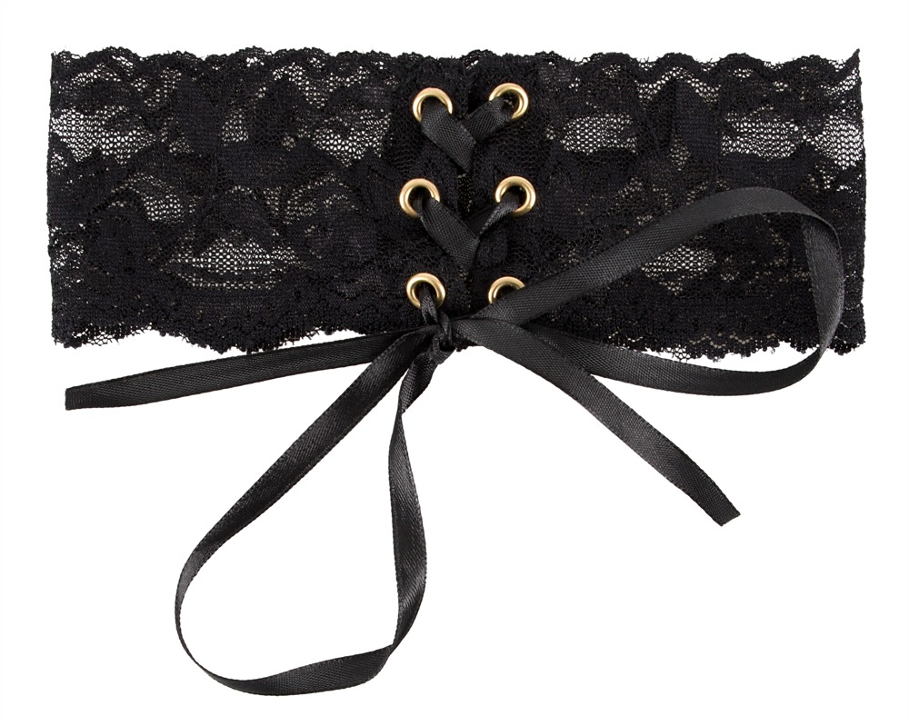 Wunderschönes Halsband aus schwarzem Spitzenband, mit 6 Ösen und Satinbandschnürung zum Schließen und Regulieren der Länge. Verschluss kann hinten oder vorn getragen werden.