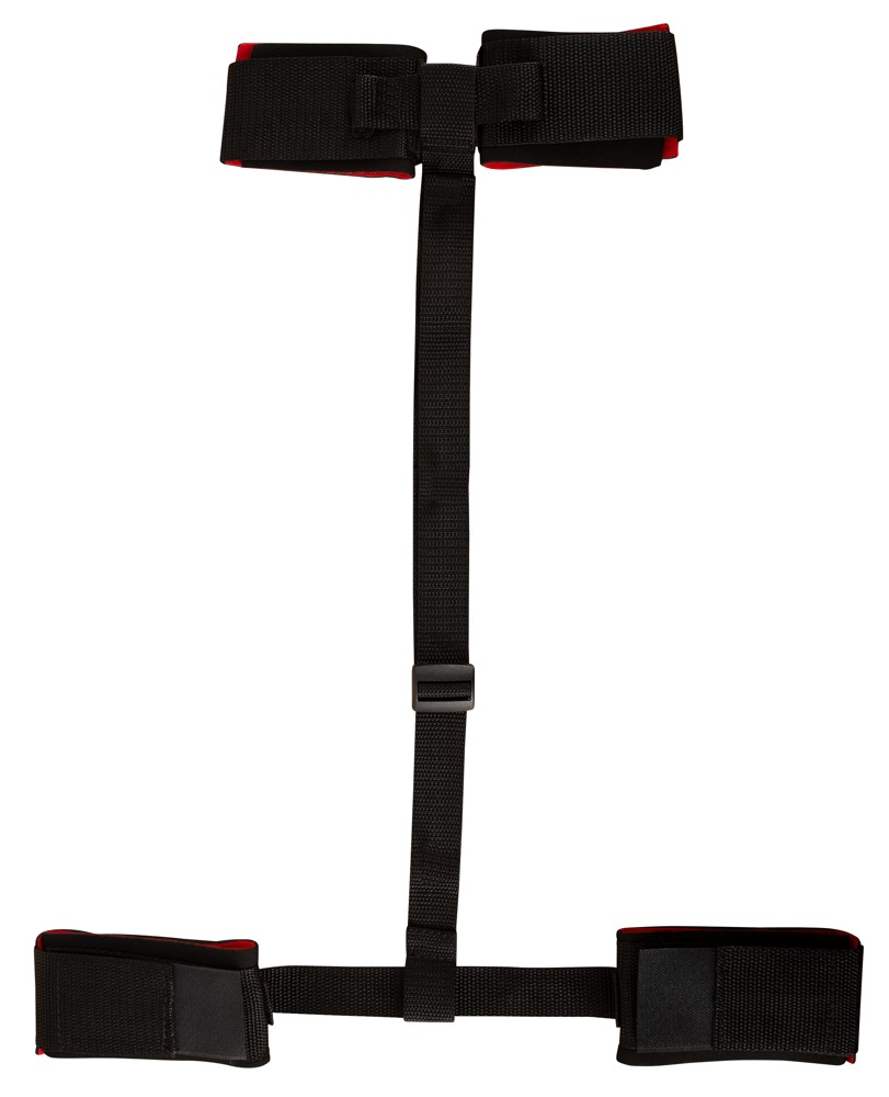 Hand- und Fuß-Manschetten an Verbindungsleine (Länge bis zu 80 cm verstellbar). Aus reißfester Kunstfaser (100% Polyamid). Manschetten soft gepolstert und durch Klettverschlüsse individuell für SIE und IHN verstellbar.