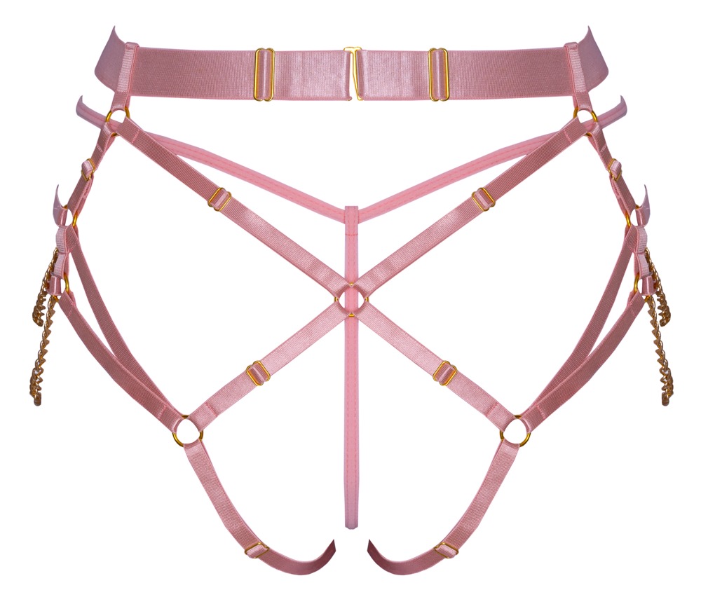 Extravaganter Harness-String von Bad Kitty inklusive Mini-String. Harness-String aus roséfarbenen, edel schimmernden Stretchriemen mit goldfarbenen Accessoires. Zusätzlich mit schwingenden Ketten vorne und seitlich glamourös in Szene gesetzt. Die weichen, elastischen Riemen und der breitere Taillengurt sind vielfach verstellbar für perfekten passenden Sitz. Ein roséfarbener Ministring ist inklusive für den weniger freizügigen Look.