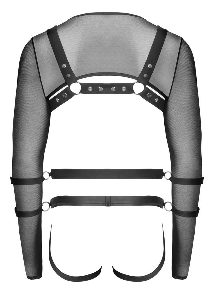 Crop-Top, Brust-Harness, Jock und 4 Hand-/Armfesseln im schwarzen Set von Svenjoyment BONDAGE. Bauch- und brustfreies Langarm-Top sowie der po-freie Jock sind aus weichem elastischen Powernet gearbeitet und mit Details im Mattlook versehen. Top mit Ring vorne. Jock mit Druckknopfleiste im Beutel. Harness mit verstellbaren Mattlook-Riemen (Druckknöpfe), Ketten und Ringen. Jeweils seitlich am Bauchgurt und am Jock-Bund mit Ringen, durch die beiliegende Fesselmanschetten durchgezogen werden können. Die soften Fesselmanschetten sind mit ihren Klettverschlüssen schnell angelegt und angepasst.