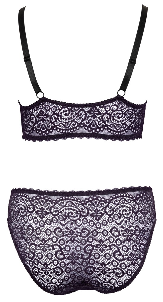 Bralette und Slip im Set von Cottelli CURVES komplett aus feiner lilafarbener Spitze. Rundum weich und elastisch für höchsten Tragekomfort. Bralette mit durchgehender Hakenverschlussleiste zwischen den Cups. Die Träger sind passend verstellbar. Und der Slip präsentiert sich gleich mit 2 Hakenverschlussleisten im Vorderteil, die auch komplett geöffnet werden können.