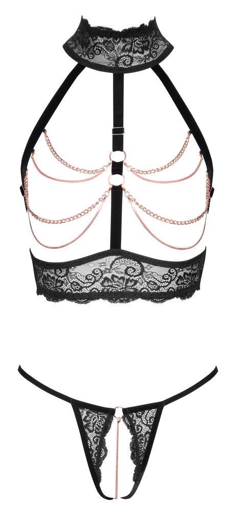 Aufregendes Ouvert-Set von Abierta Fina mit busenfreiem Top und schrittoffenem String. Schwarze weiche elastische Spitze, Samtbänder und roségoldfarbene Ketten setzen verführerisch in Szene! Ouvert-Top mit passend verstellbaren Samtbändern und -trägern. Auch der Hakenverschluss im Rücken ist passend verstellbar. Das Spitzen-Halsband als Neckholder wird mit 2 Knöpfen im Nacken geschlossen. Der String verführt mit stimulierender Kette im offenen Schritt, die auch abgenommen werden kann.