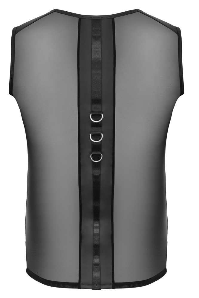 Schwarzes, ärmelloses Shirt von Svenjoyment Bondage inklusive Soft-Handfesseln. Shirt aus weichem elastischen Netz mit Details im Mattlook und silberfarbenen Accessoires. In der Front und im Rücken jeweils mittig ein Mattlook-Einsatz mit Fesselringen, in die die beiliegenden Handfesseln mit ihren Karabinerketten schnell eingehakt sind. Die soften Mattlook-Manschetten sind mit Klettverschlüssen schnell angelegt und angepasst.