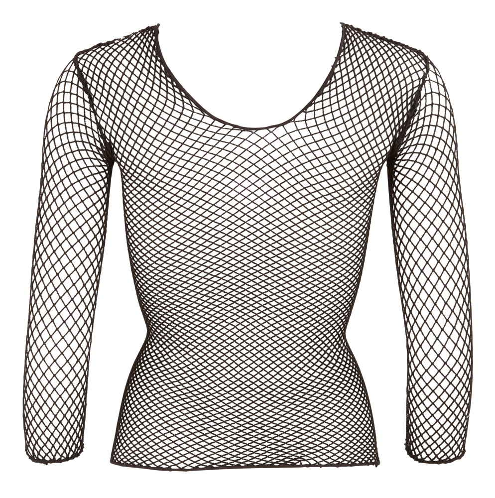 Grobmaschiges Netzshirt mit Rundhals und langem Arm. Hochelastisch und anschmiegsam wie eine zweite Haut. Tragbar mit oder ohne BH – je nach Laune und Anlass.