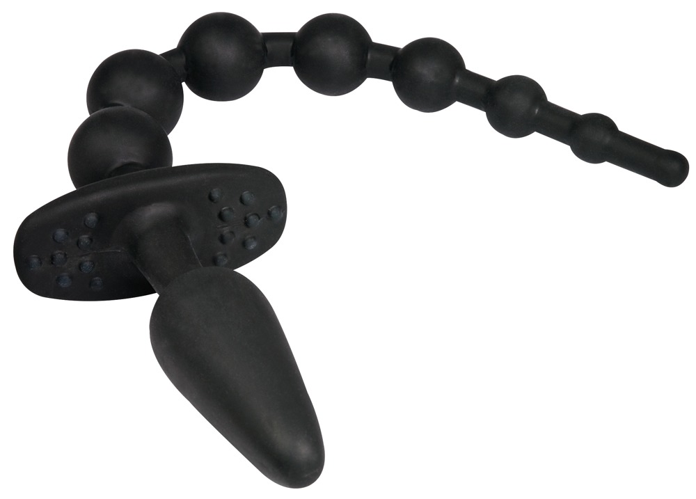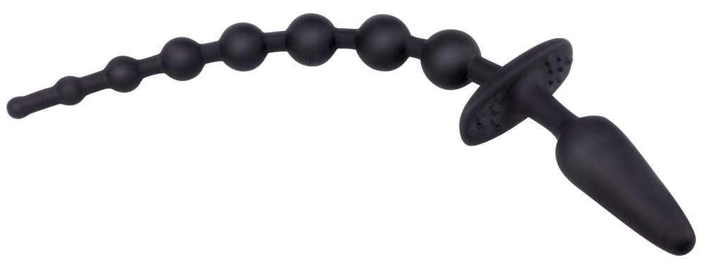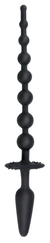Auf der einen Seite verwöhnt eindringlich der anatomisch ideal geformte Analplug mit handlich breiter genoppter Basis und auf der anderen Seite eine Kugelkette mit 7 unterschiedlich großen Kugeln. Gesamtlänge ca. 32 cm. Plug: Einführtiefe ca. 8,5 cm, Ø 1–2,4 cm. Kette: Einführtiefe ca. 21 cm, Ø 0,7–2,4 cm. Schwarz. Material: Silikon.