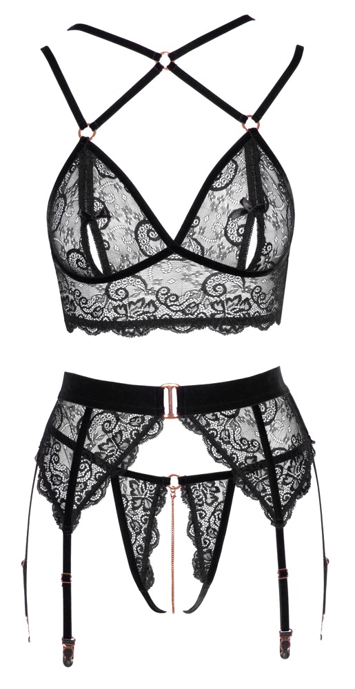 BH, Strapsgurt und String ouvert von Abierta Fina aus edler schwarzer Stretch-Spitze mit Samtdetails und roségoldfarbenen Accessoires. Der BH ist länger geschnitten und mit kleinen Hakenverschlüssen unter den Satin-Schleifchen an den geschlitzten Cups versehen, auch im Rücken befindet sich ein Hakenverschluss. Die verstellbaren Samt-Doppelträger kreuzen sich über dem Dekolleté und verlaufen hinten als 4-fache Träger. Der Strapsgurt hat ein Samtbund mit dekorativem Ring vorne und hinten ebenfalls einen Hakenverschluss - die 6 Strumpfhalter sind verstellbar. Der dazu passende String hat im komplett offenen Schritt eine abnehmbare Schrittkette.