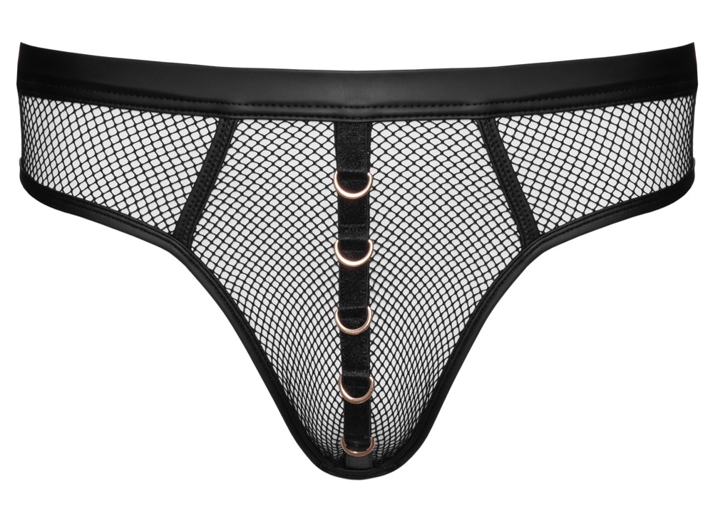 Betonender schwarzer Riostring von Svenjoyment aus luftigem Netzmaterial mit stylischen Details im angesagtem Wetlook. Mit 5 dekorativen goldfarbenen Ringen am zeigefreudigen Beutel. Der Netz-Rio ist rundum elastisch und weich anschmiegsam für hohen Tragekomfort.