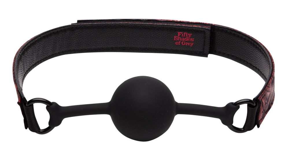 Silikon-Knebel Sweet Anticipation Ball Gag von Fifty Shades of Grey mit beidseitig tragbarem Kopfband. Eine Seite in schwarzer Lederoptik, andere Seite mit Satin im schwarz/roten Rosendesign. Komfortabel gepolstertes Kopfband mit Klettverschluss passend verstellbar.