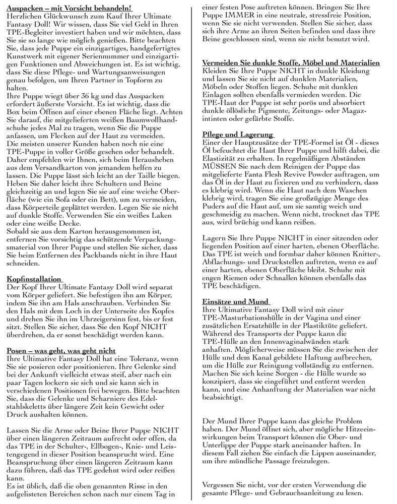 Diese lebensgroße Liebespuppe ist kaum noch von einer echten Frau zu unterscheiden! Die langhaarige Bianca hat ein bildschönes 3D-Gesicht mit haselnussbraunen Augen, Wimpern und fülligen Lippen. Ihre Haut ist aus hochwertigem Fanta Flesh Material gefertigt und fühlt sich absolut realistisch an. Ebenso sind die Vagina-, Anus- und Mund-Öffnung ganz und gar gefühlsecht. Auch die Schamlippen sind verführerisch lebensnah. Die rotblonde Schönheit hat eine schlanke Silhouette. Der extra große Busen wird mit perfekt geformten Brustwarzen komplementiert. Ihre detailgetreuen Hände und Füße überzeugen bis in die manikürten Fingernägel. Ein Alu-Skelett im Inneren macht Bianca von Kopf bis Fuß beweglich. Bolzen an den Fußsohlen ermöglichen, dass die Puppe selbstständig stehen kann. Inklusive umfangreichem Zubehör: