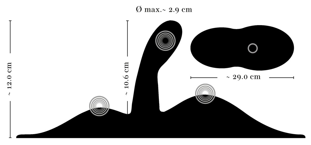 Vibrator: Einführlänge 10,6 cm, Ø 2 cm – 2,9 cm.