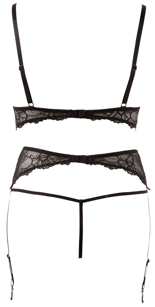 Spitzen-Set bestehend aus Soft-BH, String ouvert und Strapsgurt. Die Perlen akzentuieren den nackten Busen und offenen Schritt: sehr feminin, aber auch sehr direkt in der Aussage: Nimm mich! Träger und Strapse sind längenverstellbar.