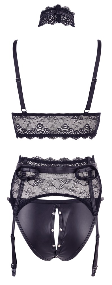 Edler Longline-BH mit aufknöpfbaren Cups, verstellbaren Riemchen-Details im Dekolleté und Halsband. Der dazugehörige Strapsgurt besticht mit einem Riemen mit Zierring in der Front. Dazu bietet er verstellbare Strapsen und abnehmbare Handfesseln mit Klettverschluss im Rücken. Inklusive Slip mit durchgehender Druckknopfleiste. Aus edler Blütenspitze kombiniert mit coolem Mattlook und Nieten.