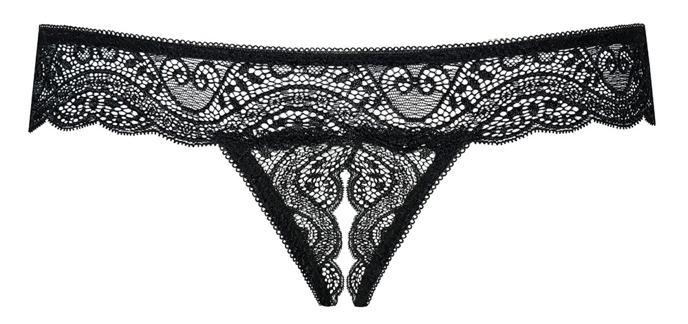 Riostring aus weicher elastischer Spitze mit etwas breiterem Spitzenbund. Im Schritt und über dem Po offen für erotische Eskapaden.