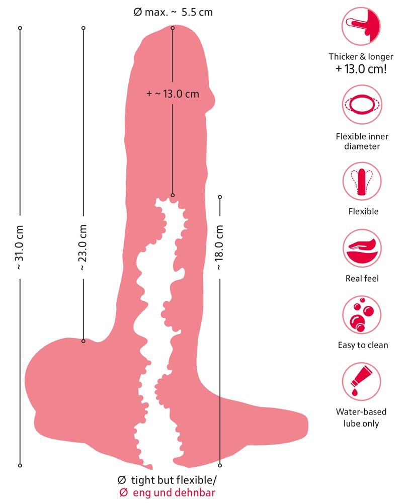 Der Penis lässt sich in den hohlen, dehnbaren Naturdildo bzw. in die Vagina leicht einführen. Im engen Inneren stimulieren authentische Reizstrukturen bei jedem Stoß. Man kann mit dem Prachtdildo ausgestattet auch den Partner oder die Partnerin tief ausfüllend beglücken – der eigene Penis wird um satte 13 cm verlängert und spürbar verdickt. Selbstverständlich kann man den flexiblen Naturdildo auch pur genießen. Intensive Stimulation und flexible Einsatzmöglichkeiten vereinen sich zu maximalem Lustgewinn.