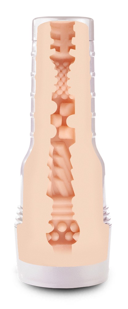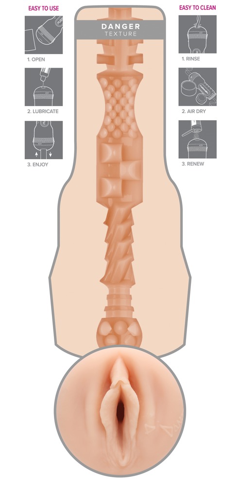 Masturbator mit Vagina-Öffnung im perlmuttfarbigen Gehäuse. Mit Orginalabdruck der Intimzone von Erotikstar Abella Danger. Im Inneren des Lustkanals sorgen unterschiedlich große Noppen, Lamellen und Rillenstrukturen für eine stimulationsintensive Oberfläche. Mit Abdeckkappe und Unterschrift des Stars neben den Schamlippen. Superskin-Textur.