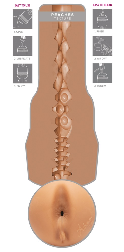 Griffiger Masturbator Autumn Falls Peaches von Fleshlight in diskreter Taschenlampen-Optik mit original abgeformter Anus-Öffnung von Erotikstar Autumn Falls. Und auch das sehr abwechslungsreich strukturierte Innenleben mit verschiedenen Durchmessern kommt dem engen Analkanal von Autumn ganz nah und sorgt für eine intensive, orgasmuswirksame Massage beim Handjob. Die Innensleeve aus hautähnlichem super softem Material ist neben der Öffnung mit einem Autogramm von Autumn versehen und lässt sich zur Reinigung leicht aus dem Masturbator entnehmen.