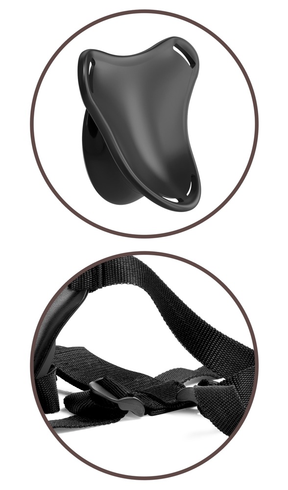 Das einfache Strap-on-System basiert auf der anatomisch gewölbten Körperplatte mit Andockmulde, in der der Saugfuß des Dildos bombenfest fixiert/angedockt wird und ihn in stoßfreudiger Position hält (Push & Play). Die Körperplatte verteilt den Druck gleichmäßig auf den Beckenbereich, sodass punktueller unangenehmer Druck vermieden wird. Die stabilen breiten Gurte sind für festen und komfortablen Sitz in der Passform mit Kunststoffgleitern verstellbar. Es kann auch jeder andere herkömmliche Saugfuß-Vibrator/Dildo an/in dem Body Dock fixiert werden.