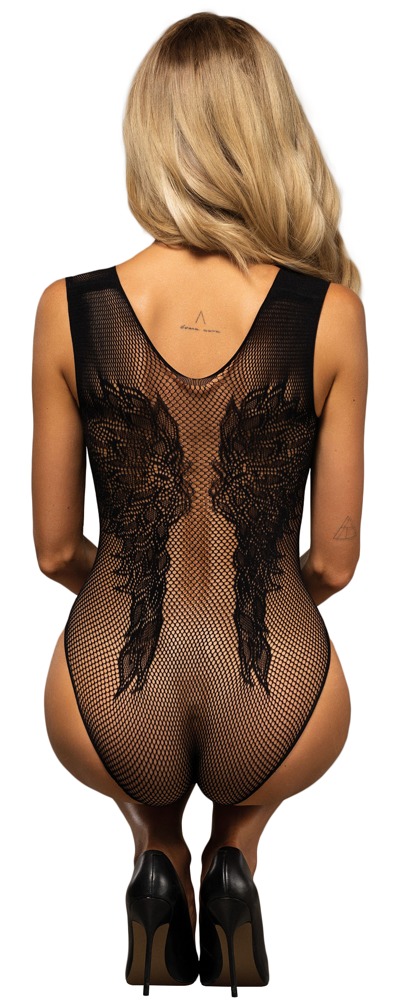 Der Body B112 von Obsessive überzeugt mit unglaublich weichem Mesh, das sich an die Haut schmiegt. Die Vorderseite ziert ein großformatiges Blumenmotiv, die Rückseite überrascht mit einem Paar eingewebter Flügel. Der Schritt ist einladend offen. Die breiten Träger können auch lasziv über die Schulter gestreift getragen werden.