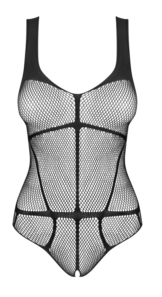 Schwarzer hochelastischer Body ouvert B336 von Obsessive aus weichem seidigem Netz. Die eingewebte Harness-Optik setzt Kurven perfekt in Szene. Aufregend knapp geschnitten und im Schritt verführerisch offen.