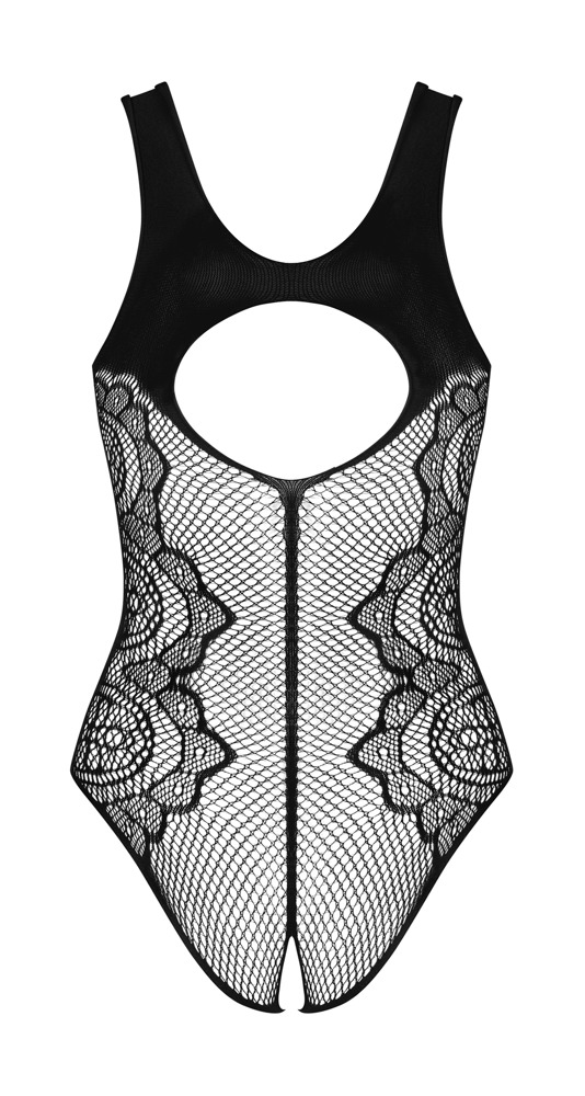Schwarzer hochelastischer Body ouvert B335 von Obsessive aus weichem seidigem Netz. Die seitlich eingewebten Ornamente setzen Kurven perfekt in Szene. Aufregend knapp geschnitten mit Cut-out im Rücken und im Schritt verführerisch offen.