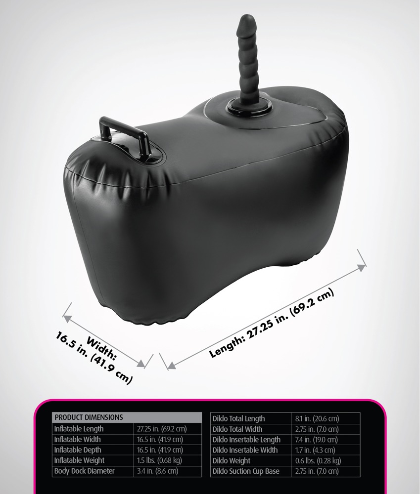 Aufblasbares Liebeskissen Body Dock Inflatable Love Seat von Fetish Fantasy Series mit patentierter Body Dock Toy-Halterung für beiliegenden Dillio Platinum Dildo mit Saugfuß. Auch jedes andere Toy mit einem Saugfuß (z. B. Vibrator, Masturbator) kann auf der Andockplatte leicht und fest platziert werden. Perfekt für wilde Reitvergnügen, bei denen man sich am stabilen Griff bequem festhalten kann. Das ideal große Luftkissen gewährleistet dabei komfortable Unterstützung und spannende Zurückfederung.