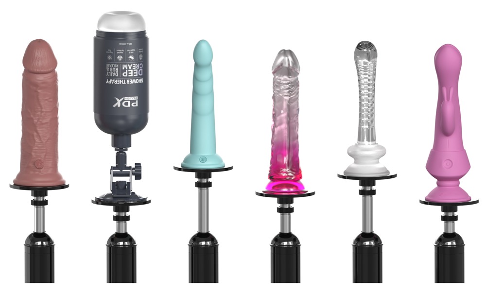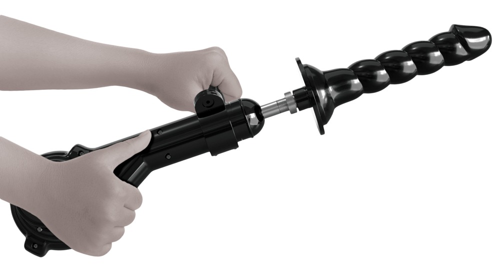 Beiliegender Dildo verfügt über einen Saugfuß, der auf der patentierten Push & Play Andockplatte (Ø 8,9 cm) perfekt haftet. So ist der Rillendildo schnell und einfach am Stoßarm der Sexmaschine angebracht. Auch jedes andere herkömmliche Saugfuß-Toy (z. B. Dildo, Vibrator, Masturbator) kann an der Andockplatte leicht befestigt werden.