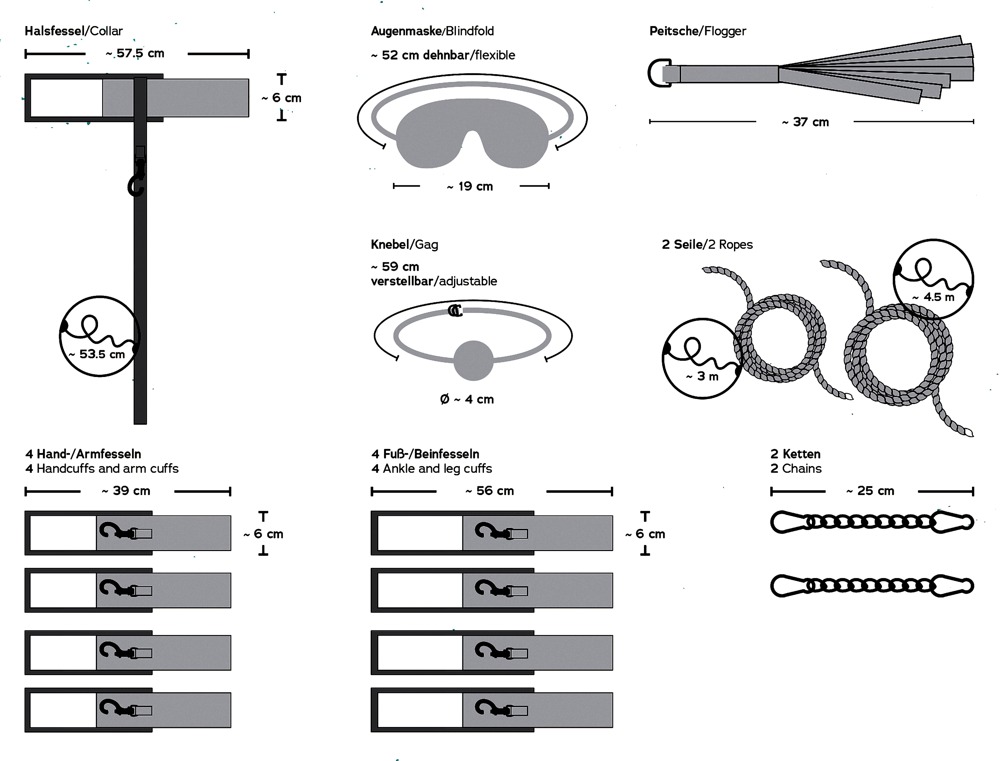 Alle Fesseln 5 cm breit, mit Klettverschlüssen verstellbar und jeweils mit 6,5 cm langem Karabiner.