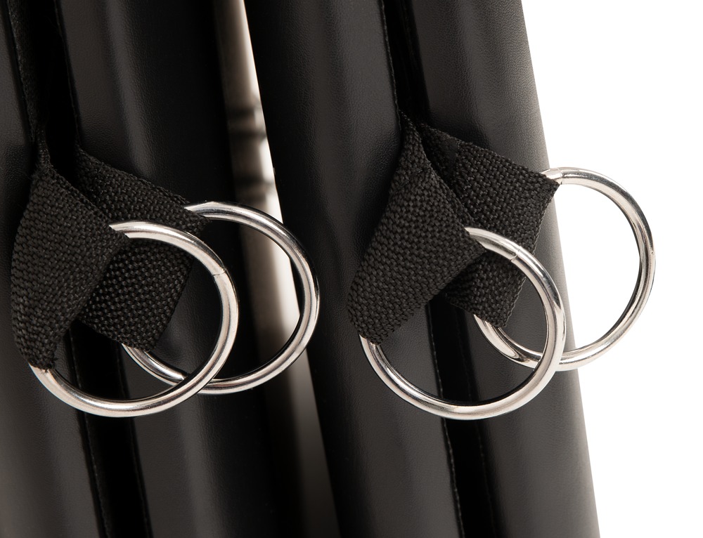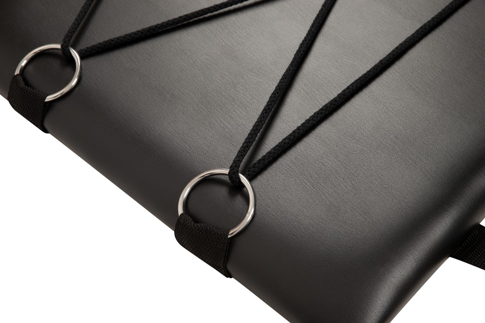 Am schnell aufgebauten Bondage Board sind jeweils 8 Ringe pro Seite und jeweils 1 Ring am Kopf- und Fußende fest angebracht (Ring-Ø je 4,5 cm), in denen die beiliegenden Fesseln schnell mit ihren Karabinern individuell eingehakt sind.