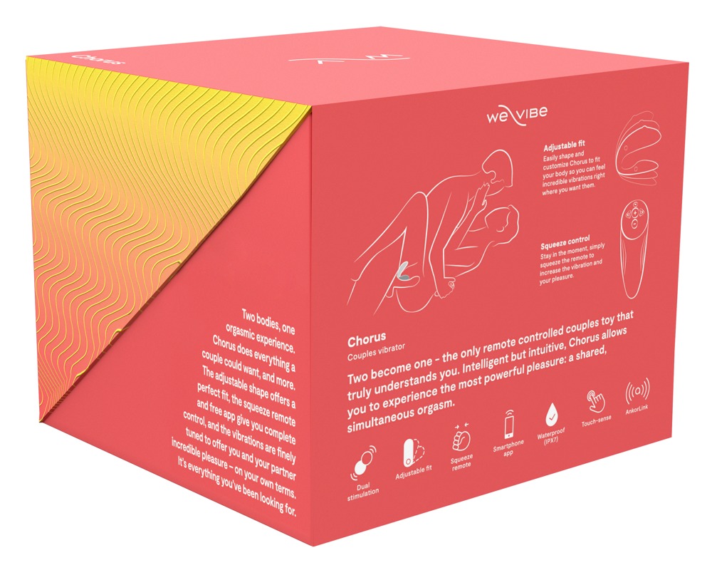 C-förmiger Paarvibrator, der mit 10 und mehr Vibrationsmodi verwöhnt. Er ist flexibel und bleibt nach dem Umstellen in der Position, um sich individuell jeder Körperform anzupassen. Die neue AnkorLink™ Technologie stellt eine Verbindung zur Fernbedienung her, die dann als Signalverstärker mit dem Paarvibrator verbunden ist und eine bessere Verknüpfung zur App ermöglicht. Damit wird die Problematik des Bluetooth übergangen, welche im menschlichen Körper oft Verbindungsfehler meldet. Die Fernbedienung selbst verfügt zusätzlich noch über Squeeze Control, welches die Intensität der Vibrationen durch Druck auf die Fernbedienung verstärkt. Der Chorus selbst verfügt über Sensoren, die im Touch-Sense-Modus eine Steuerung über Handauflegen ermöglichen. Die App ermöglicht eine Fernsteuerung über große Distanzen und Erstellung von persönlichen Vibrationsmodi. Auch eine Vibration zum Rhythmus von Musik ist möglich. Der Chorus kommt mit einer diskreten Aufbewahrungsbox, in der Fernbedienung und Vibrator aufgeladen werden können. Spaß überall ist möglich, da der Chorus wasserdicht ist. Inklusive USB-Ladekabel für Magnetic-Charger-Box.