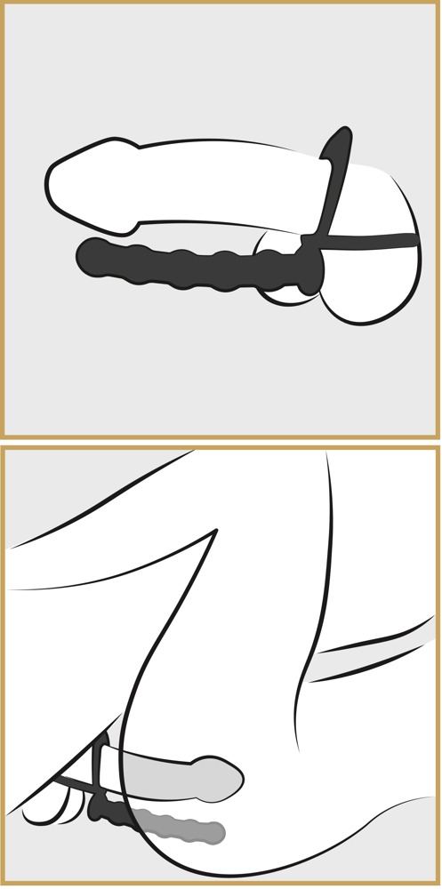 Penis-/Hodenring mit Analdildo. Einfach die beiden entsprechenden Ringe über Penis und Hoden streifen - und schon bist Du mit einem zweiten gleitfreudigen, biegsamen Glied ausgestattet, um Deine Partnerin gleich doppelt zu beglücken! Penisring mit Klitoris-Reiznoppen. Alles mit gleitfreudiger Soft-Touch-Oberfläche. Gesamtlänge 19 cm, Analdildo 12,5 cm lang, Ø max. 2,3 cm. Penisring-Ø 3,8 cm (dehnbar), Hodenring-Ø 5 cm (dehnbar). Silikon, PU-Beschichtung.