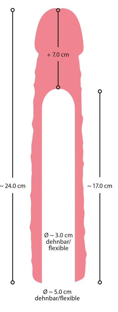 Gesamtlänge 24 cm, Einführtiefe 17 cm, Innen-Ø 3 cm (sehr dehnbar), Außen-Ø max. 5 cm. Gewicht 254 g.