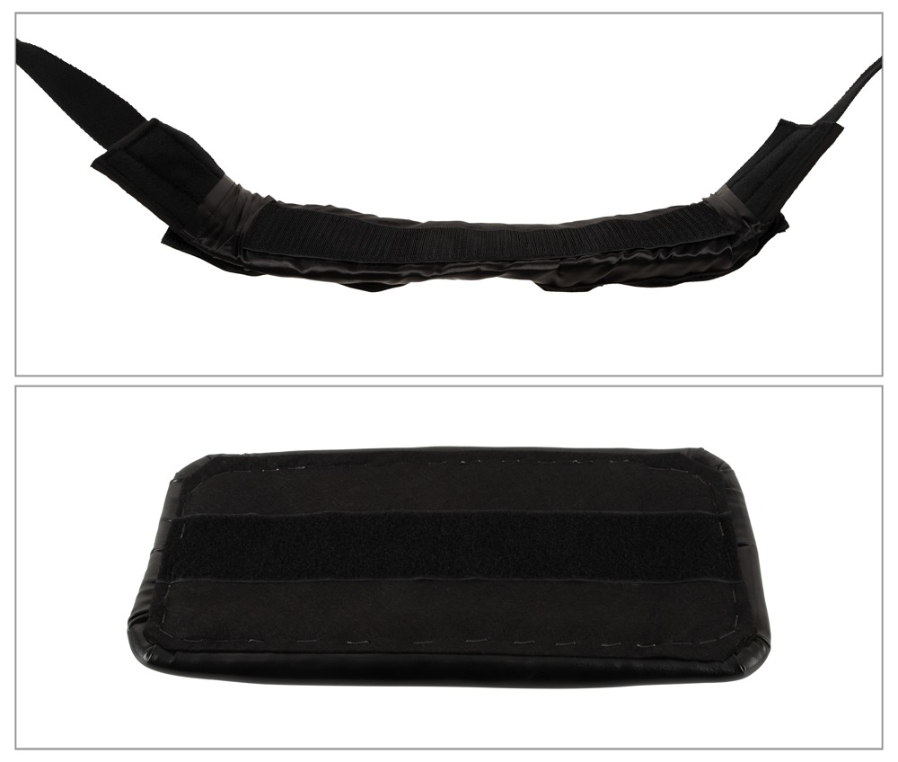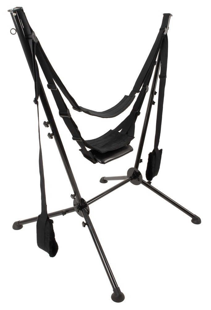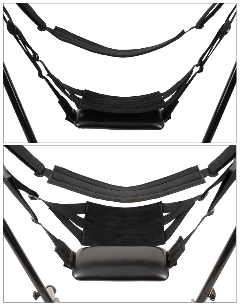 An reißfesten Gurten hängen das weiche Sitzpolster und die beiden soften Liegepolster für Rücken und Kopf/Nacken sowie die beiden bequemen Plüsch-Halteschlaufen für Hände, Beine oder Füße. Alle Gurte sind individuell in der Länge passend verstellbar. Die Sitzfläche kann auch abgenommen werden (Klett).