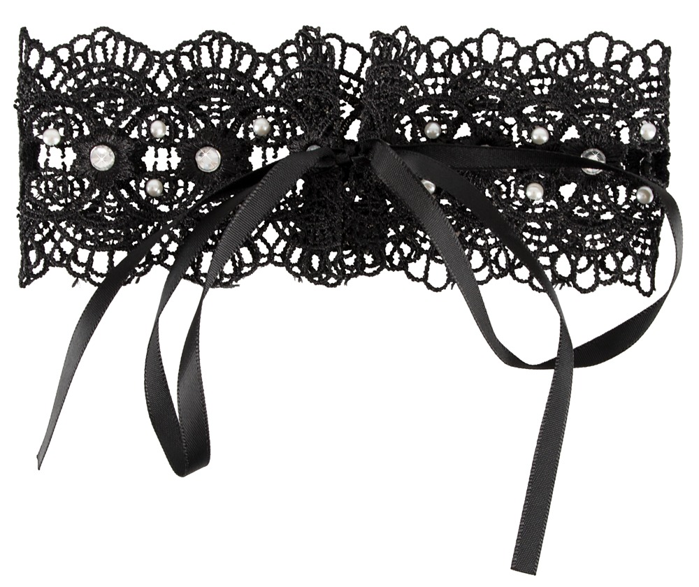Schwarzes, gesticktes Halsband mit weißen Perlen und Strasssteinen besetzt. Hinten mit Satinschleife zum Binden.