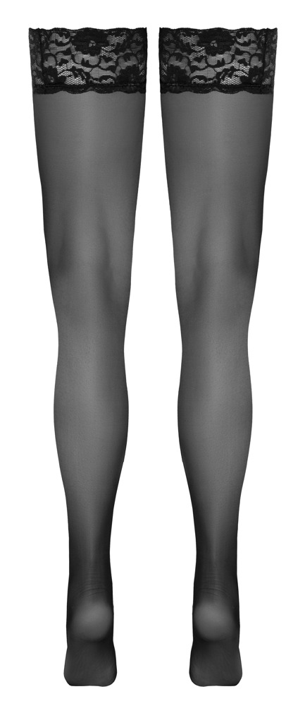 Halterlose schwarze Strümpfe von Cottelli LEGWARE mit schönem 9 cm breitem Spitzen-Abschluss. Innen mit Silikonverstärkung für rutschfesten Sitz und optimalen Halt. Garnstärke 20 den. Oeko-Tex zertifiziert.