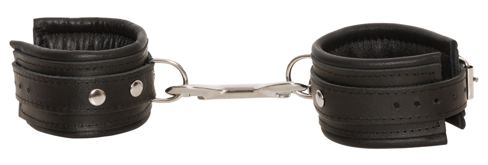 Innen mit glattem Leder weich gepolsterte Handfesseln von ZADO in kurzer Form - ideal für schmale Gelenke und komplett aus schwarzem Leder. Schnallenverschluss verstellbar. Mit Doppelkarabiner.