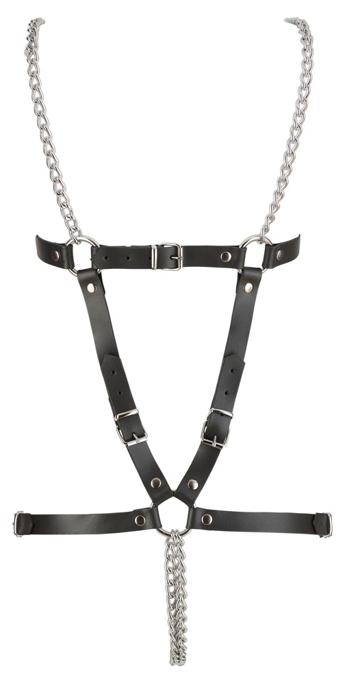 Lederriemen, kombiniert mit stählernen Ringen, Metallketten-Trägern und zwei Metallketten im komplett offenen Schritt. Alle Riemen verstellbar für perfekte Passform.