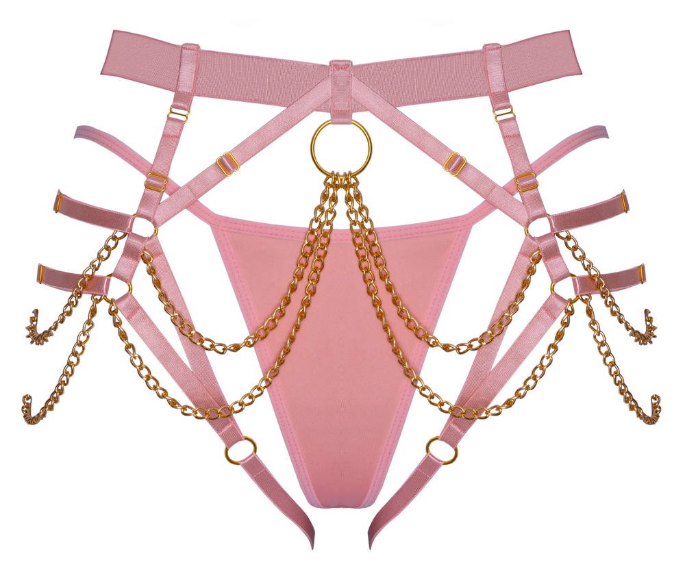 Extravaganter Harness-String von Bad Kitty inklusive Mini-String. Harness-String aus roséfarbenen, edel schimmernden Stretchriemen mit goldfarbenen Accessoires. Zusätzlich mit schwingenden Ketten vorne und seitlich glamourös in Szene gesetzt. Die weichen, elastischen Riemen und der breitere Taillengurt sind vielfach verstellbar für perfekten passenden Sitz. Ein roséfarbener Ministring ist inklusive für den weniger freizügigen Look.