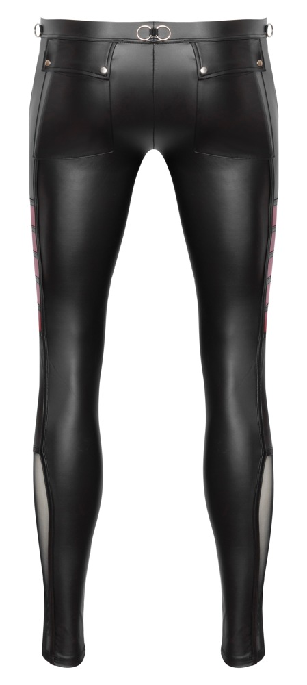 Eng geschnittene Hose von NEK im schwarzen Mattlook mit roten Kontrasten und markanten Nieten- und Ring-Details. Jeweils unten am Bein transparenter Netz-Einsatz. Mit bezogenem Gummizug-Bund und rundum weich & elastisch für hohen Tragekomfort. Vorne unterlegter Reißverschluss. Hinten 2 aufgesetzte Klappentaschen.