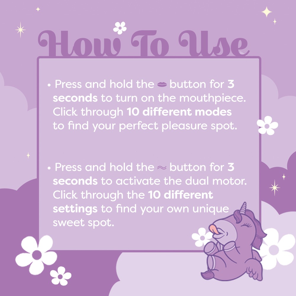 Niedlicher Auflegevibrator Karma Lilac von Unihorn in Form eines kleinen Einhorns. Das weiche griffige Silikon-Toy verwöhnt mit vielseitigen Vibrationen und seinem intensiv pochenden Massage-Schnäuzchen. Der Deluxe-Doppelmotor sorgt dabei für zuverlässige Power. Bequem per Knopfdruck sind jeweils 10 verschiedene Modi der Vibrationen und Klopfmassage getrennt steuerbar. Ein magisches Toy für vielseitige Spiele – allein oder zu zweit – zuhause oder unterwegs!