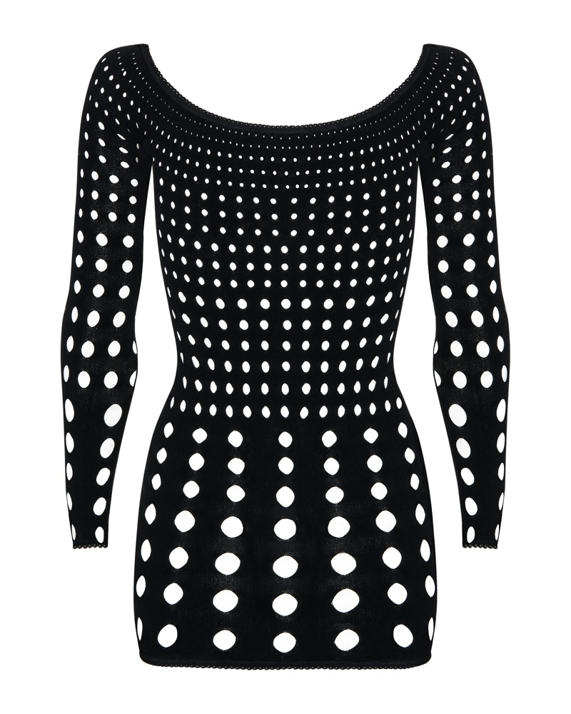 Kurzes enges schwarzes Kleid Rocker von Obsessive mit langem Arm. Rundum in extravaganter Loch-Optik. Anschmiegsam weich und elastisch für hohen Tragekomfort.