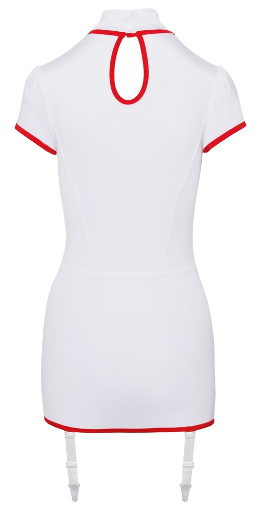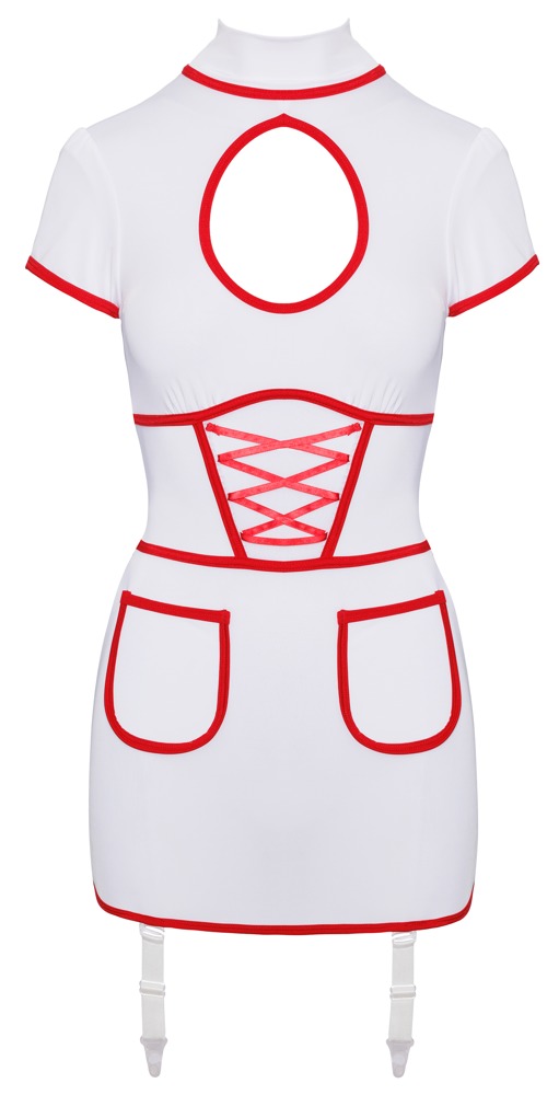 Semi-transparentes kurzes Strapskleid im Krankenschwester-Look von Cottelli COSTUMES in Weiß mit kontrastierenden roten Details. Rundum elastisch in enger figurnaher Schnittführung mit halbem Arm und großem Cut-out im Dekolleté. Vorne zwei aufgesetzte Taschen und Powernet-Einsatz unter dekorativer Zierschnürung. Stehkragen mit 2 Knöpfen im Nacken. Die verstellbaren Strumpfhalter sind auch komplett abnehmbar.